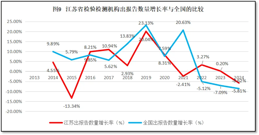江苏省检验检测机构出具报告数量的增长率与全国的比较如图9所示。